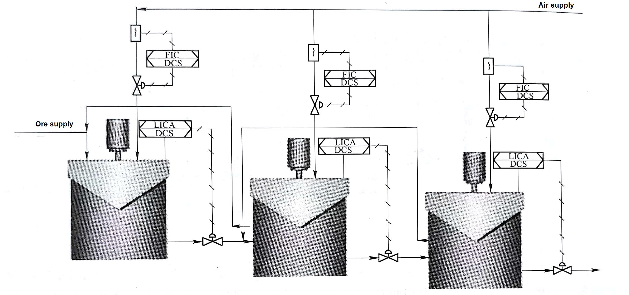 The air charge of the floatation tank should be adjusted according to the characteristics of the mineral properties and the concentration of the pulp, so as to meet the need of mineral flotation. Figure 4 gives a diagram of the control principle of the air charge in each flotation cell. The air flow meter and the regulating valve are installed on the air supply pipe for each flotation cell, and the PID control can be used.